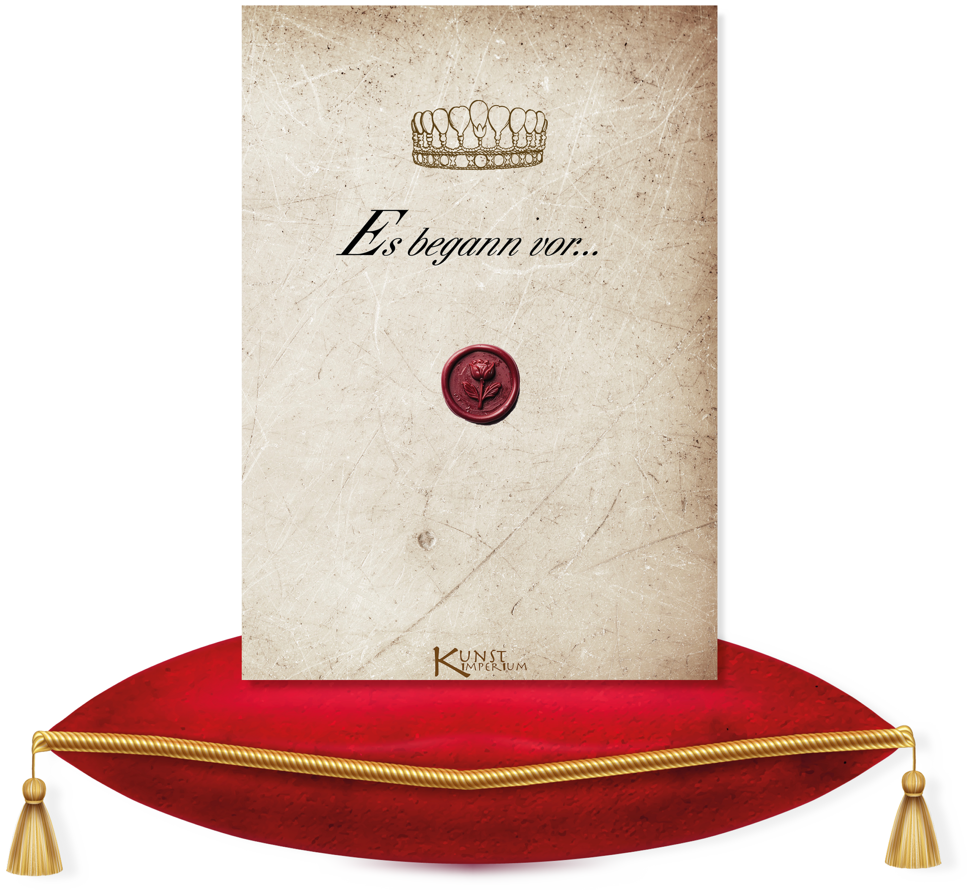 Das gelieferte Siegel bildet eine andere Rose ab und wird in rosafarbenem Wachs geprägt, nicht in dem oben gezeigtem Burgunderrot!