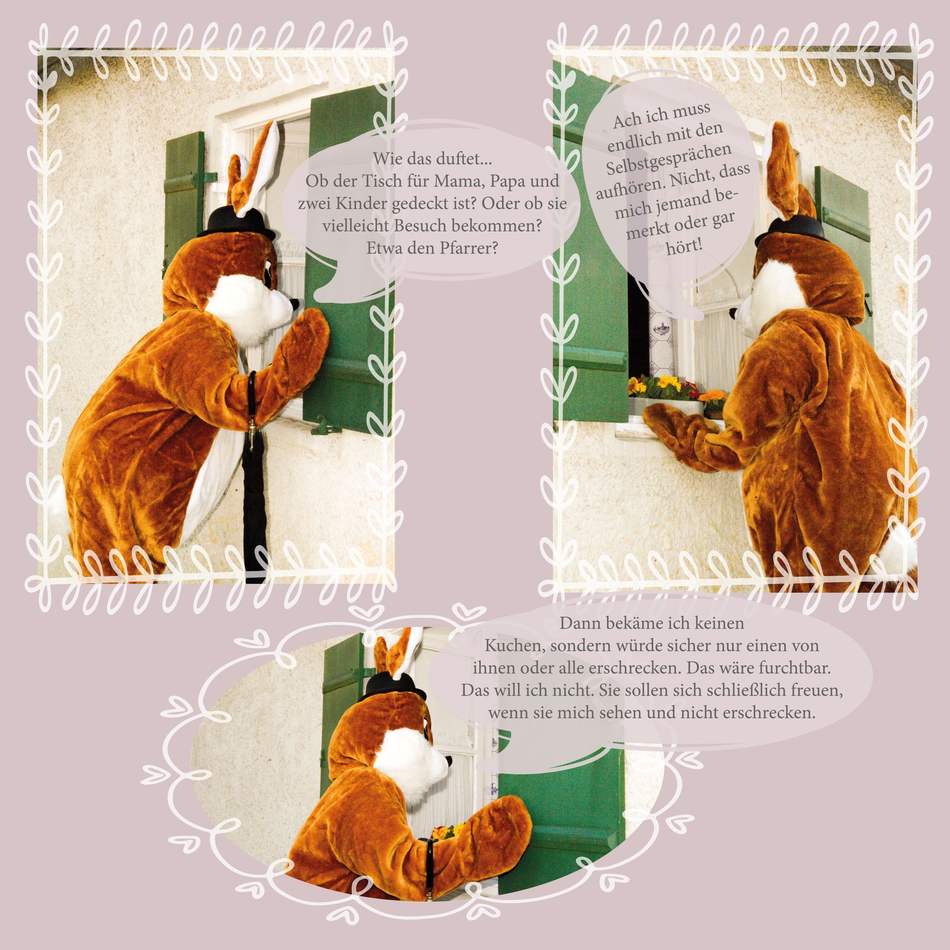 Sir Hops genießt eine kleine Mittagspause in den herrlichen Sonnenstrahlen am See. Während er an seiner Möhre knabbert, bemerkt er plötzlich einen angenehmen Duft. Der neugierige Osterhase beschließt dem verführerischen Duft zu folgen. Dieser führt ihn zu einem offenen Fenster eines kleinen Häuschens. Sir Hops sieht zum Fenster hinein und erblickt einen schön gedeckten Kaffeetisch.